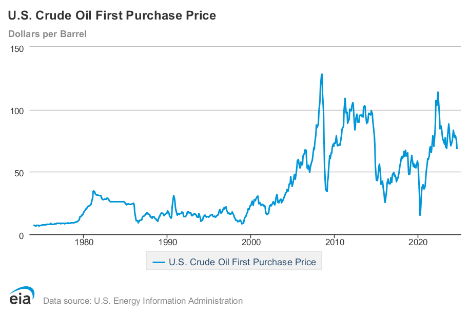 Crude oil price, major decline in 2008, 2015, and 2020
