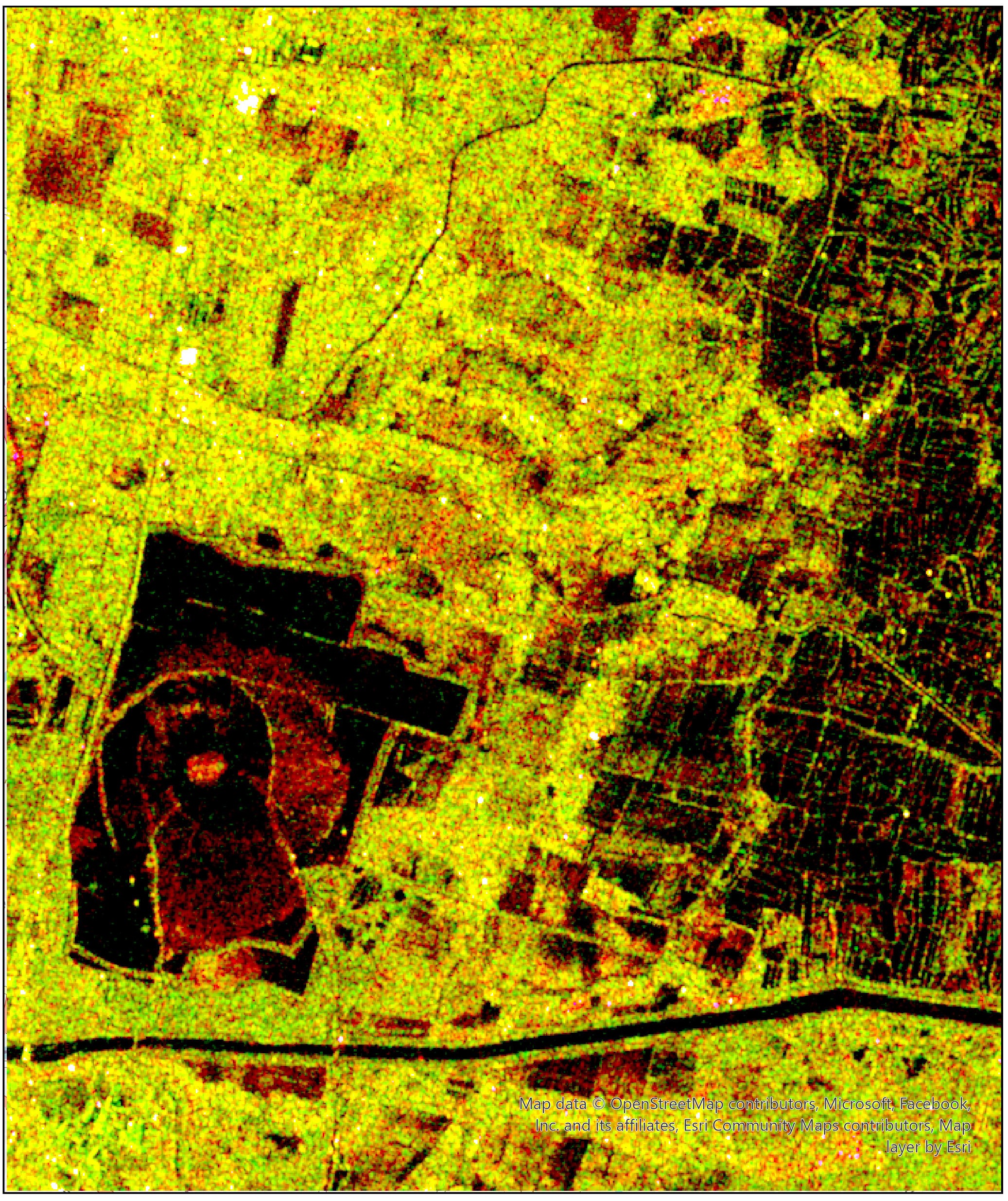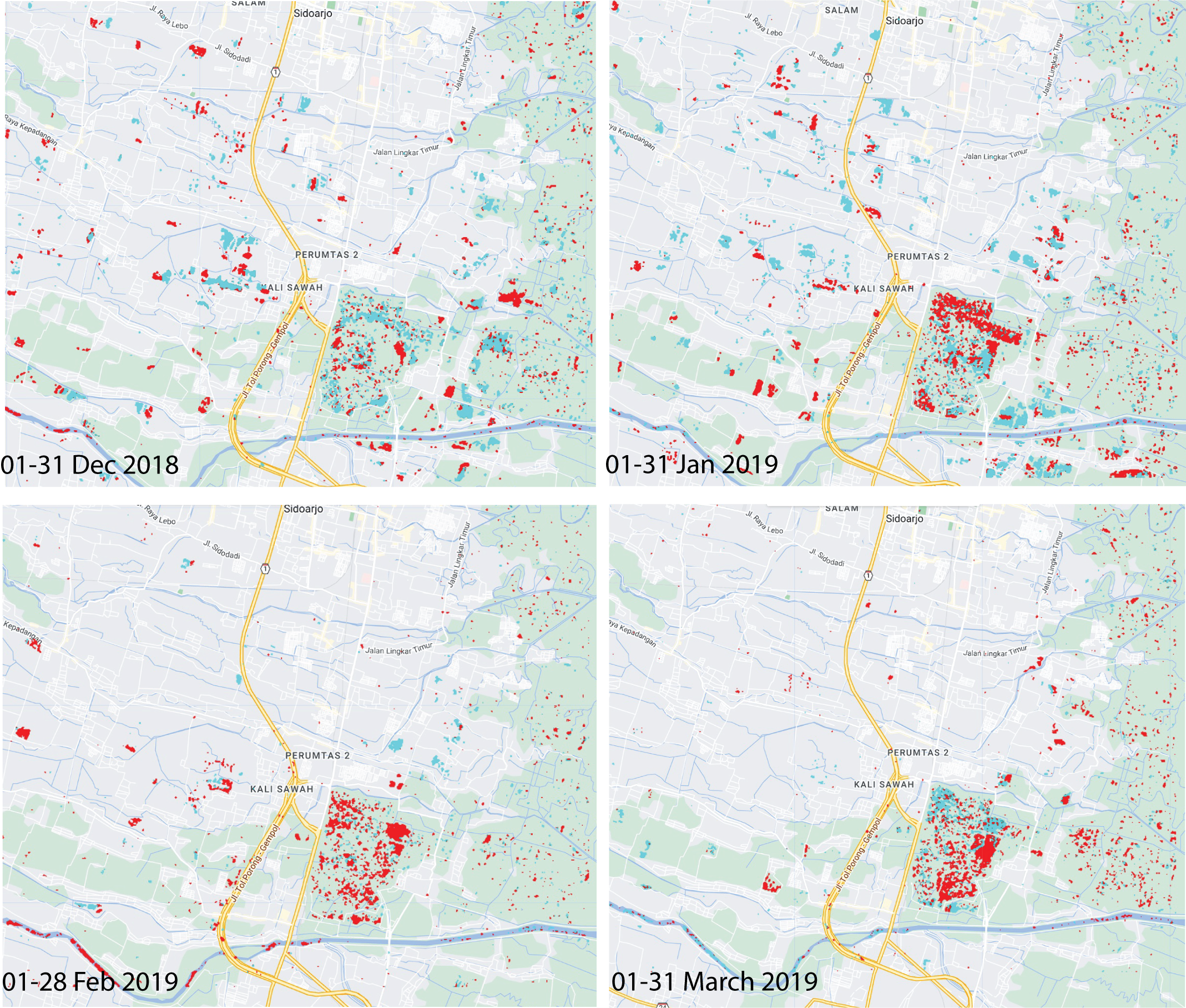 Flooding events typically occur during the rainy season, particularly in December and January. The image above shows a flooding event in the Sidoarjo area, where the strongest negative signal (light blue) is observed during December and January, corresponding with the peak precipitation in the region. The intensity gradually decreases (red), indicating positive change in February and March, with the blue areas shrinking compared to earlier months. A notable anomaly is seen in Tanggulangin district, where the floodwaters persist longer, as indicated by the blue areas still present (February) and beginning to recede (red) by March. Now that we have identified the flood pattern, the next step is to apply different SAR-based approaches to detect and analyze ground deformation in the study area to determine if subsidence is a contributing factor