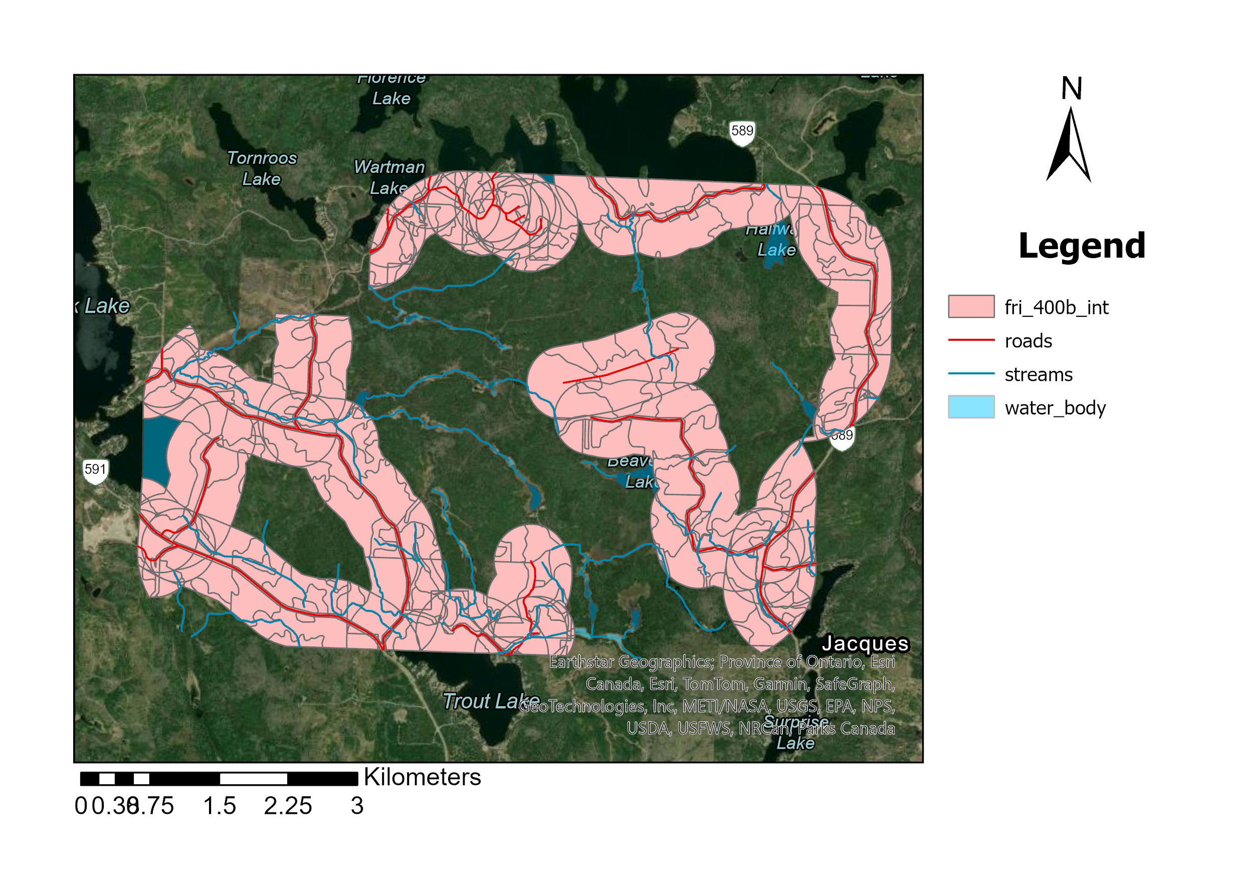 - Intersection Operation: Each of these “fri” feature classes is intersected with the previously created buffered feature classes. This operation spatially combines the features to analyze their overlapping areas