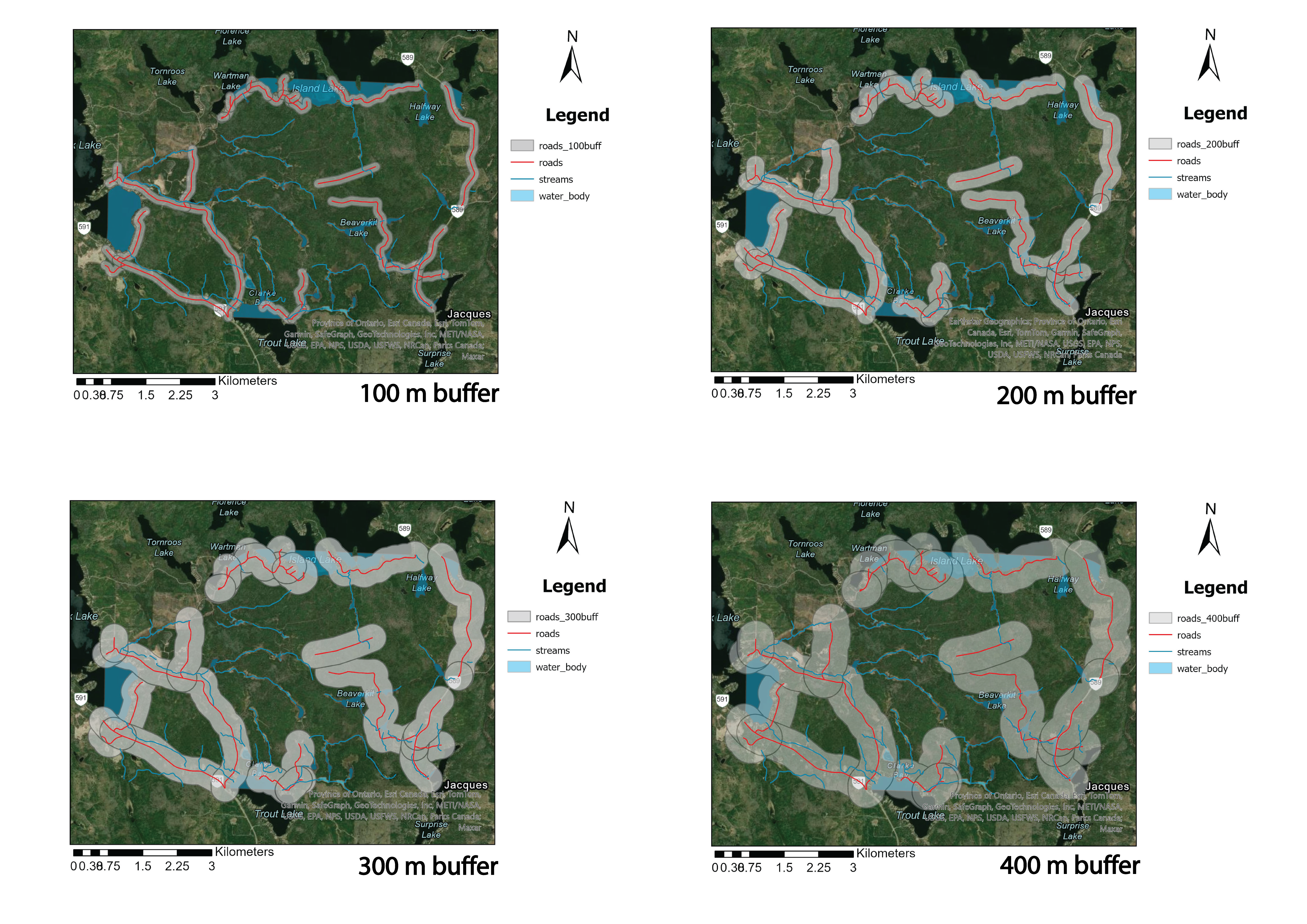 Extracted buffer distance analysis, from left to right : (100 m buffer, 200 m buffer, 300 m buffer, 400 m buffer)